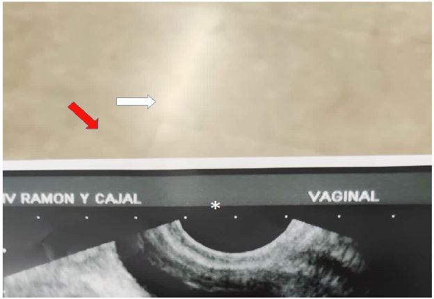 The upper part of her vagina was not connected to the introitus. The rectal ultrasound was used to facilitate the visualization of the hydrocolpos (Figure 2). Therefore, the upper vaginal space was opened under ultrasound guidance and clear liquor drained from it. Methylene blue was used to rule out a bladder connection.