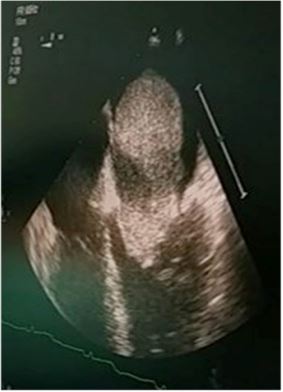 Patient’s vital signs were within normal ranges, his Electrocardiogram (ECG) showed sinus rhythm. The myxoma was found incidentally on Transthoracic Echocardiogram (TTE) and the size of the mass was confirmed to be 5 cm x 5 cm attached to the interatrial septum with one third of the mass extending to the left ventricle (Figure 1). His left ventricle A normal ejective fraction LVEF was 50-55%, with mild Mitral Regurgitation (MR), moderate to severe Mitral Stenosis (MS) and Tricuspid Tegurgitation (TR). It was also showed high Pulmonary Arterial Systolic Pressure (PASP) with 73 mmHg. On computed Tomography (CT) of the thoracic region (CECT thorax), it showed a 5 cm x 4 cm x 3 cm large mass attached to the atrial septum in the left atrium.