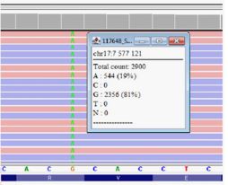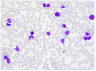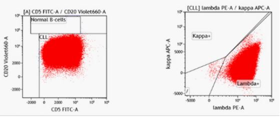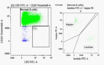 In August 2019, a 56-year old man was presented to our center with multiple peripheral and intra abdominal lymphadenopathies, hepatosplenomegaly in the presence of B symptoms. On admission, his complete blood count showed a white blood cell (WBC) count of 69,9 х 109 /L with 55% mature-looking lymphocytes, hemoglobin (Hb) 80 g/L and platelet count 45 х 109 /L (Figure 1). Flow cytometry analysis of the peripheral blood showed expression of CD45, CD19, CD5, CD23 and CD22 low (Figure 2). Conventional cytogenetic tests and fluorescence in situ hybridization (FISH) revealed complex karyotype, 73% of analyzed cells displayed deletion of 17p13 (Figure 3) and 41% of analyzed cells displayed deletion of 13q14. NGS assay for detection of TP53mut identified pathogenic mutation in position 273 in exon 8 with variant allele frequency (VAF) 50% (Figure 4). Mutation status of the heavy chain variable region genes corresponded to the unmutated variant of the disease. The patient was diagnosed as high risk CLL - Rai stage IV, Binet stage C.