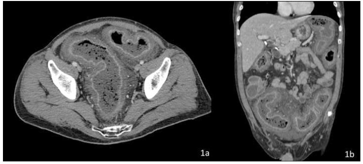 Computed tomography (CT) with IV and oral contrast revealed severe, diffuse colonic wall thickening, pericolic fat stranding and marked enhancement of the colic mucosa and submucosa secondary to hyperemia (Figure 1).
