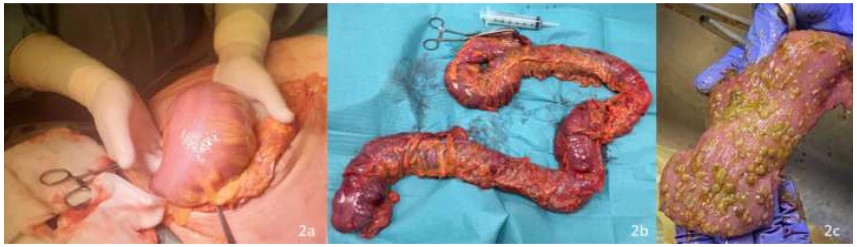 Intraoperatively, a modest amount of citrine fluid was found and sent for microbiological examination. The whole colon and the proximal rectum appeared severely dilated and edematous, with a greyish serosa. No signs of perforation or necrosis were evident. A laparotomic total colectomy was performed by dividing the terminal ileum, resecting the entire colon, and dividing it at the rectosigmoid junction, leaving a blind, closed-off pouch of rectum in the abdomen (Figure 2). An open abdomen approach was used due to the concurrent small bowel distension and the patient’s hemodynamic instability, to decrease risk for postoperative intra-abdominal hypertension. 48 hours later, after the patient’s stabilization and the subsiding of the edema, a terminal ileostomy and abdominal wall closure was performed. The postoperative course was uneventful, and the patient was discharged on postoperative day 10.
