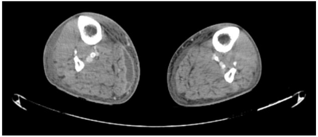 One week later, the patient recovered kidney function, and resolution of cardiovascular dysfunction occurred, enabling the cessation of vasopressor support, but progression with inflammatory signs in the entire right arm and Right Leg (RL) was noticed. CT scan revealed significant periarticular edema on the RK, soft tissues marked swelling and a 6 x 1.5 cm collection in the middle third of the RL (Figure 1). Magnetic resonance image (MRI) identified a 15 x 6 x 1.5 cm collection in the biceps brachii muscle subfascial plane (Figure 2) and an elongated set of collections, measuring up to 2 cm, involving almost the entire lateral longitudinal axis of the arm.