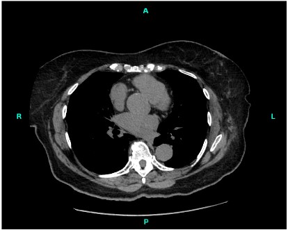 Chest X-Rays after the removal of the chest tube from a single AP view were taken and compared to Chest X-Rays taken prior to the interval removal of the chest tube. Subcutaneous emphysema and a small left apical pneumothorax were seen again. Additionally, there was linear atelectasis or scarring was noted at the right lung base and opacity at the left lung base was observed and noted to likely be atelectasis. The heart size remained normal and degenerative changes were noted in the spine. The small left apical pneumothorax had not significantly changed since the last chest X-Ray one day prior. Additionally, non-contrast axial multidetector CT scans of the chest were taken from lung apices to lung bases four months after the VATS procedure (Figure 2). The left lower lung lesion from prior study had been removed and surgical clips and scarring were identified in the images.