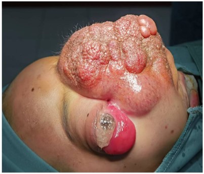 Ocular examination showed the tumor size was about 10 x 10 cm, with granular hyperplasia on the surface, accompanied by increased hair and pigmentation; The tumor is located in the middle of the face and the entire alar of the nose is completely destroyed (Figure 1); light perception was exist only in the left eye; proptosis cannot be measured due to the huge tumor size; eye movement are severely restricted in all directions in both sides; the inferior bulbar conjunctiva of both eyes is highly edematous and prolapsed outside the palpebral fissure; the corneal epithelium has a large defect area and the stromal layer is infiltrated in both eyes; the anterior chamber is normal and bilateral pupil diameter were about 5-6 mm with RAPD+ and fundus details were blurred in both sides.