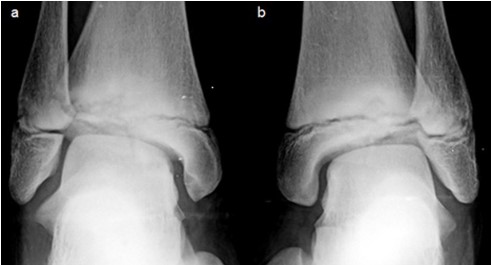 A 13-year-old boy was referred to the pediatric orthopedics department of our hospital with progressive pain in his right ankle over the past eight months. He did not recall any history of trauma to his ankle and had no medical history. He had no intensive sports training. On physical examination, he was overweight with a BMI of 27 Kg/m2. The right ankle was swollen, with normocoloured skin and without local heat. Its active and passive mobilization was painful with decreased mobility range. Neither foot deformity nor limb length discrepancy were noted. Blood tests were negative and an inflammatory or infectious etiology was ruled out. Antero-posterior radiographs of both ankles revealed a bilateral sclerotic and flattened median and lateral aspect of the distal tibial epiphyses predominantly on the right side (Figure 1).