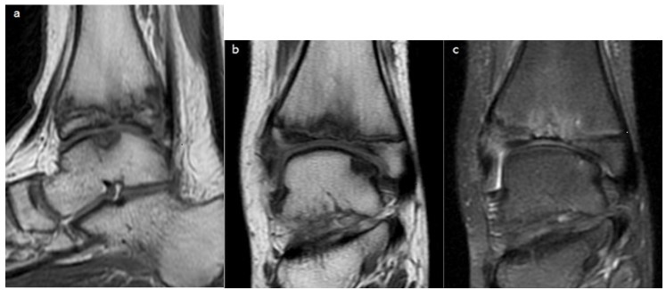 An MRI of the right ankle was performed showing fragmentation of the distal tibial epiphysis with erosion and bone marrow edema of the epiphysis and adjacent metaphysis. A consequent osteochondral lesion of the talar dome was also noted (Figure 2).