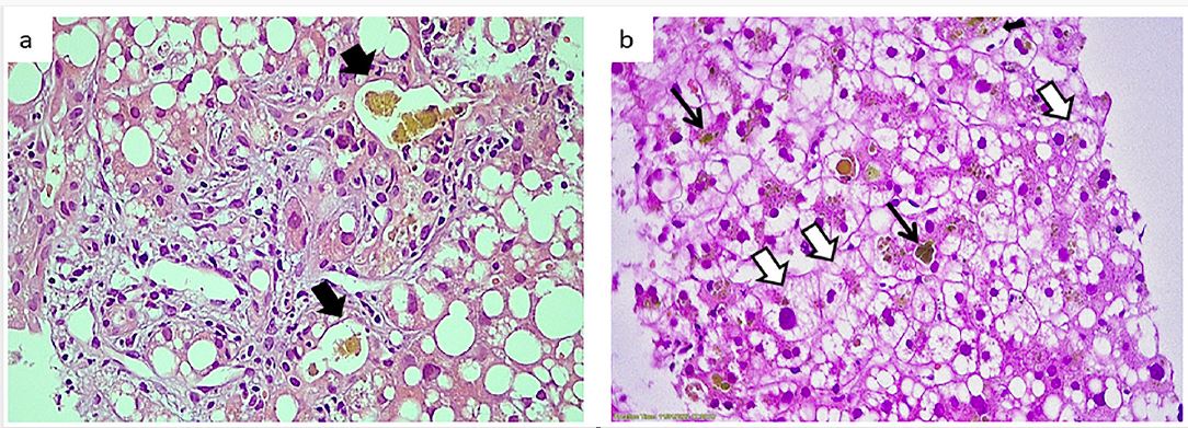 Histologically, hepatic parenchyma showed severe steatosis, large and small droplet macrovesicular as well as microvesicular, characterized by numerous tiny fat droplets within hepatocyte cytoplasm, resembling alcoholic foamy degeneration. There was also marked hepatocellular and canalicular cholestasis predominantly in zones 3 and 2, as well as prominent ductular reaction periportally (zone 1) accompanied by the presence of bile concretions in the lumen of dilated cholangioles. This feature referred as cholangiolar cholestasis or cholangitis lenta, although not entirely specific, it raises high suspicion of sepsis [14]. On the other hand, the pattern of steatosis implied a toxic liver injury similar to the one observed after parenteral administration of tetracycline. Since no sign of infection was identified after thorough evaluation, drug toxicity was implicated for liver dysfunction and antimicrobial agents were discontinued. After withdrawal, patient’s laboratory status gradually improved. She was discharged with near normal hepatic biochemistry, creatinine concentration approximately 2 mg/dl, no coagulation disorders, and better regulation of tacrolimus levels.