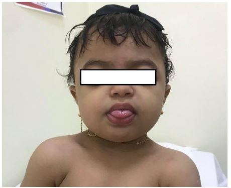 We present the case of a two years old female child who was initially referred to the clinical genetic clinic at the age of one year and three months with the main presenting complaints of developmental delay, facial dysmorphism, hypotonia, congenital cardiac defects, and rectoperineal anus. She was born term through spontaneous vaginal delivery to a primiparous mother of 24 years old and father of 26 years old of a non-consanguineous marriage. At an early neonatal age, the patient had an episode of febrile seizures that was managed conservatively without significant consequences.