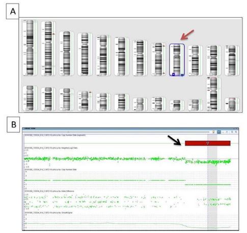 Chromosomal karyotyping analysis was performed at the level of 400-600 bands resolution, and it showed normal female karyotype 46, XX. CGH analysis revealed a 1.211 Mb (mega bases) deletion with the breakpoints of 1,001 kbp deletion at the distal part of the long arm of chromosome 9q34.3.