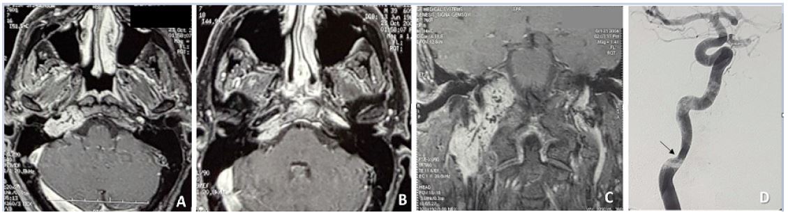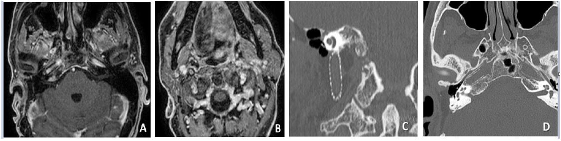 High-Resolution Computed Tomography (HRCT) of the temporal bone and skull base and gadolinium-enhanced Magnetic-Resonance Imaging (MRI) of the brain and neck showed involvement of the vertical and horizontal portions of the petrous segment of the ICA and two distinct masses at the level of the parapharyngeal space and jugular foramen, suggestive for a TJP (Class C3De1) and VP (Stage I) (Figure 1).
