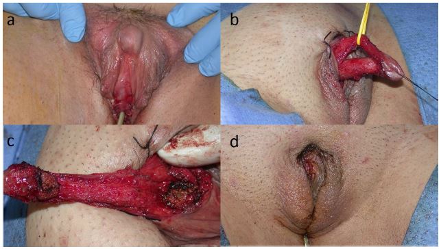 Clitoral reduction was then performed. The skin of the shaft was mobilised down to the base of the corpora cavernosa by a coronal incision. The next step was the dissection of the neurovascular bundle from the corpora cavernosa finding an avascular plane with a longitudinal incision at 9 and 3 o’clock. The pedicle was separated proximally from the tunica albuginea and a loop was passed through the hole created which facilitated the rest of the dissection of the pedicle from distal to proximal (Figure 3b). Once the corpora were dissected from the dorsal NV pedicle, until their bifurcation under the symphysis pubis, the corpora cavernosa were removed (Figure 3c). Then we had a dorsal strip containing dorsal arteries, nerves, and deep dorsal vein of clitoris under Buck’s fascia supplying the glans. Afterwards, one third of the lateral aspect of the clitoroideal skin was removed to reduce the size of the gland. Finally, the clitoris was reattached to the corporeal stumps near the lower edge of the pelvis with absorbable sutures (Figure 3d).