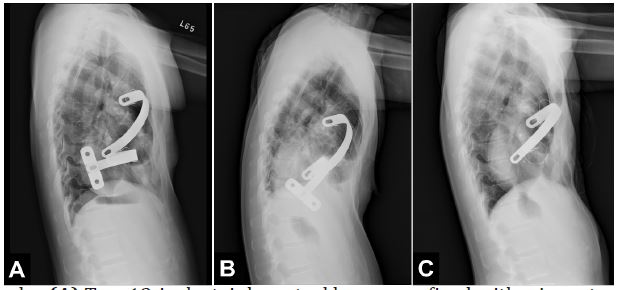A 43-year-old woman presented with occasional chest discomfort since adolescence. She came to the outpatient clinic for medical consultation, where pectus excavatum was diagnosed (Haller index of 7.5 and sternovertebral distance of 6.2 cm), and the Nuss procedure was arranged by a thoracic surgeon. She had no known past medical history, and the cardiac workup did not reveal dysrhythmias or any structural abnormalities, including intracardiac thrombi. During the operation, two stainless steel bars were inserted and fixed with wire sutures, leaving the lower stabilizer (Figure 1A). Her postoperative clinical course was uneventful, so she was discharged on the eighth day after the surgery.