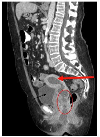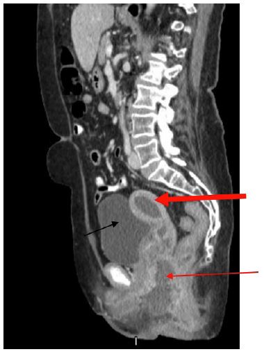 On post-operative day (POD) 9, the patient presented with fever and vulvar pain. Her exam revealed induration along left labia extending lateral to the anus. Computer tomography (CT) showed an abscess (Figure 1). Patient underwent incision and drainage and drain placement in the operating room. After 48 hrs of intravenous Piperacillin/Tazobactam she was discharged home with oral Amoxicillin/Clavulanic acid to complete a 14-day course.