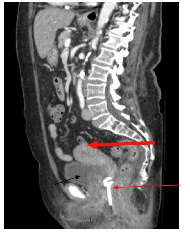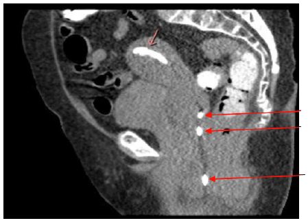 The patient represented on POD 18 again with fever and worsening perineal pain. She was febrile, white blood cell count was elevated, and CT showed a similar fluid collection in the uterus and re-accumulation of the perineal abscess (Figure 2). She was admitted for antibiotic administration and interventional radiology was consulted for drainage of the two areas of abscesses. On POD 19, a drain was placed vaginally into the uterus as well as a second drain into the perineal collection (Figures 3 & 4). The cultures ultimately revealed multidrug resistant Escherichia coli and Enterococcus raffinosus. She was subsequently treated with Meropenum. The patient improved and was discharged home on POD 27 without any further treatment necessary.