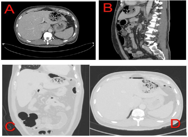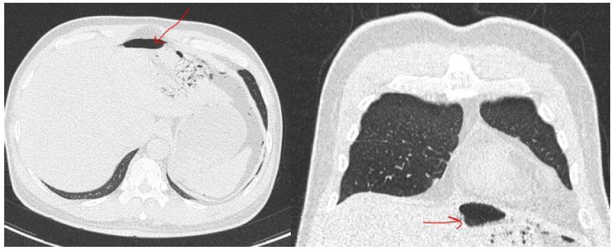 Initially the ER physician suspected it might be covid infection, hence CT and covid PCR was ordered for him. The test was negative for covid, and CT chest didn’t reveal chest infection, nevertheless, it showed air under diaphragm (Figure 1).