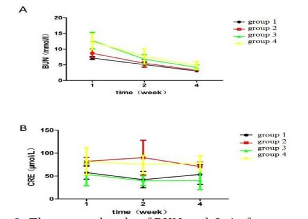 As shown in Figure 2, compared with the sham operation group, the serum levels of BUN and Cr in the two operation group were significantly increased, indicating that the modeling was successful. Compared with the operation + non- Chinese medicine intervention group, the serum levels of BUN and Cr in the operation + Chinese medicine intervention group did not change, indicating that the model of chronic renal failure was successfully established, but the drug did not play a significant role in the model. At the same time, it could be seen that with the increase of time, the urea nitrogen level in the serum gradually decreased, while there was no obvious rule of creatinine change.