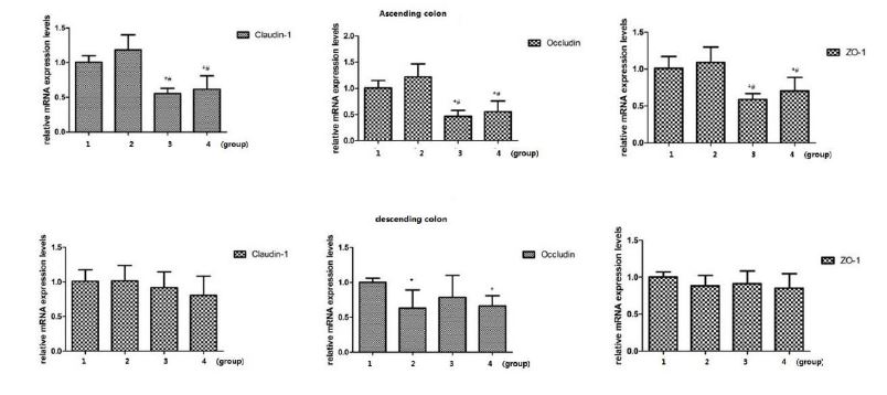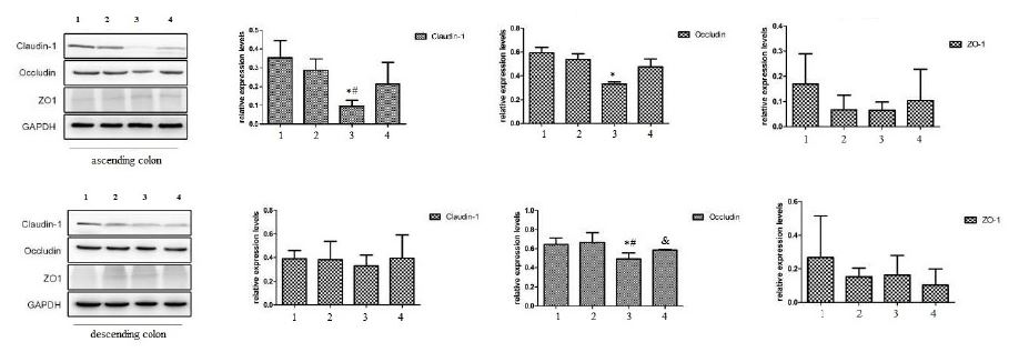 The protein level of Claudin-1, Occludin and ZO-1 was similarly with the results of RT-PCR. As shown in figure 4, compared with the sham operation group, the expression of tight junction-associated proteins (Claudin-1 and Occludin) in operation group was significantly decreased. Compared with the operation group, the expression of Occludin in the ascending colon was significant elevated in the operation + Chinese medicine intervention group. The other two proteins were elevated but without significant difference.