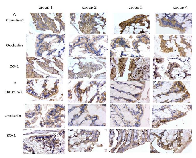 The immunohistochemistry assay was similarly with the results of RT-PCR and western blot (Figure 5). Compared with the sham operation group, the expression of tight junction-associated proteins (Claudin-1 and Occludin) in operation group was significantly decreased. After Traditional medicine intervention, the expression of Claudin-1 and Occludin in the ascending colon was significant elevated. However, The ZO-1 proteins were elevated but without significant difference.