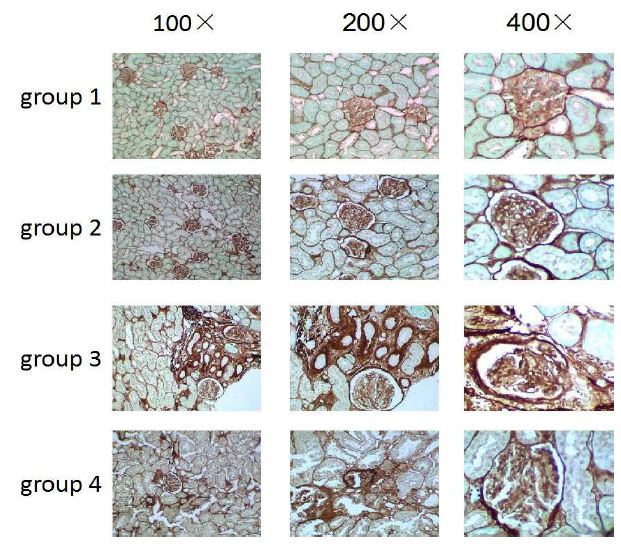 In two sham operation groups, the glomerular structure was normal, while some tubular epithelial epithelium was mildly edematous and vacuolar degeneration. Part of the renal interstitial was scattered in a small amount of chronic inflammatory cells. However, in operation group, more glomerular volume was reduced, and some glomerular structures were destroyed and disappeared. Partially proximal tubules were with severe vacuolar degeneration and epithelial atrophy, and brush-like edges were disappeared. Unstructured protein tube type and more red blood cells were found in partial lumen. Renal interstitial granules were infiltrated in more chronic inflammatory cells with fibrous tissue hyperplasia. After Traditional medicine intervention was processed, the lesion has a certain degree of improvement (Figure 6).