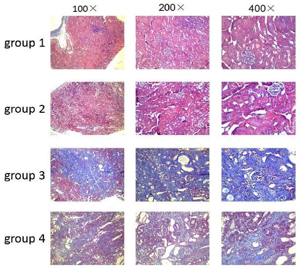 Microscopic examination results displayed that a small proportion of renal interstitial fibrous tissue was slightly hyperplasia in two sham-operation group. However, a large number of fibrous tissue hyperplasia were observed in some renal interstitial companying with some glomeruli and renal tubules atrophy and disappear in operation + Chinese medicine intervention group and operation+ non- Chinese medicine intervention group (Figure 8).