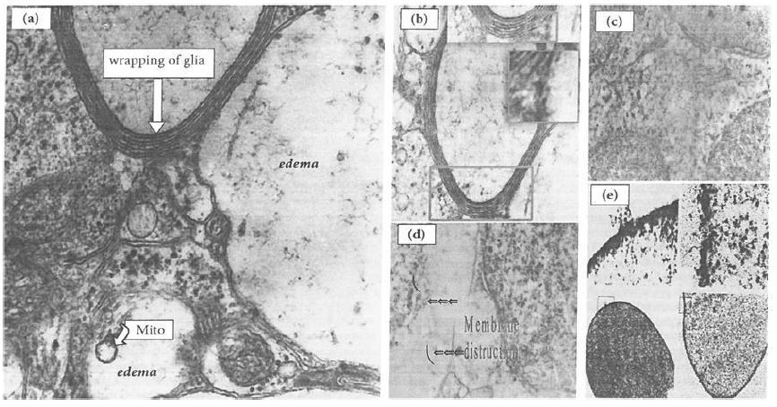 (a) edema and (b–e) local membrane lesions: (b) alterations in glial cells, which form multilayer wrappings around the areas of edema and neuronal damage (damage areas are shown in insets); (c, d) alterations in a layer of cerebellar granule cells (from local lesions to cell fusions); (e) a redistribution of proteins from a soluble state to a membrane-associated state in erythrocytes and local damage to erythrocyte membranes [81,82].