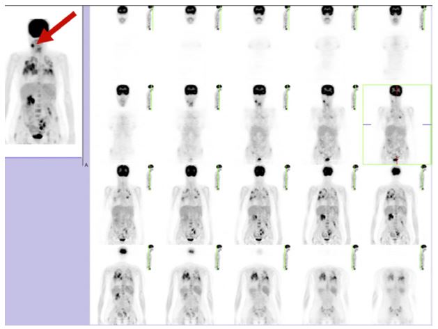 In October 2019, the patient started noticing a hard and painful submandibular mass of approximately 1 cm in diameter that had regrown on the right side of the hypopharynx. The Positron Emission Tomography (PET) scan and needle biopsy confirmed the diagnosis of SCC of the head and neck region (Figure 2). Considering the disease persistence and absence of distant tumor metastasis by imaging techniques, we performed rescue surgery on the right cervical region. During the procedure, we found that the primary tumor had spread to one of the 14 removed lymph nodes, invading the extracapsular, vascular and perineural regions and surgical margins. Despite these risk factors, the patient did not receive any adjuvant treatments due to the previous toxic effects and cumulative radiation dose.