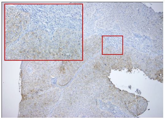 While considering other treatments, we sequenced a panel of 160 genes by next generation sequencing techniques. We could detect the presence of Neurotrophic Tyrosine Receptor Kinase (NTRK1) oncogenic fusion and then, NTRK1 gene overexpression was confirmed by immunohistochemistry (IHC) (Figure 4). Then, in March 2020, she obtained expanded access to larotrectinib, taken as 100 mg every 12 hours. After the first 28-day cycle, we observed objective response with complete disappearance of the cervical cutaneous node, gradual improvement of dysphagia and secondary weight gain. In the first reassessment (June 2020), we only reported a hyper capturing nodular thickening at the distal portal of the sternocleidomastoid muscle. In the second one (October 2020), the CT scan results showed complete objective response to larotrectinib (Figure 3B).