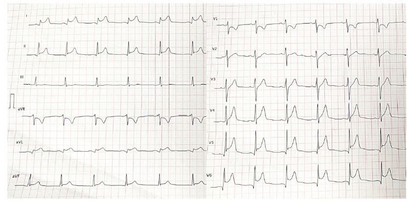 Diagnostic assessment: The ECG showed ventricular tachycardia (Figure 3). Biologically, the ultra-sensitive Troponin I level was 1.97 ng/mL (normal value NV< 0.04 ng/mL), CRP was 24.3mg/L, kalemia was 4.2 mmol/L, and TSH was 1.06 mIU/L.