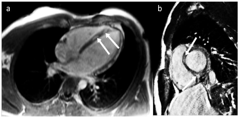 Echocardiography did not show any particularity. Cardiac MRI showed late enhancement at the septo-apical level (Figure 2). The diagnosis of acute myocarditis was retained.