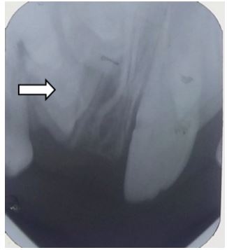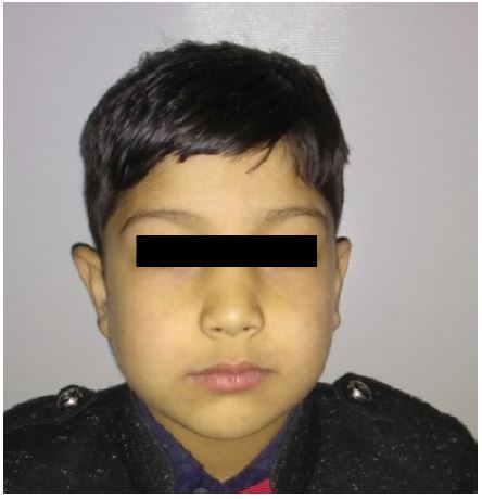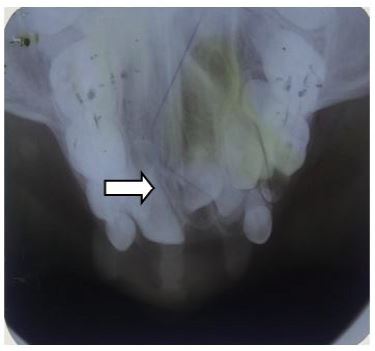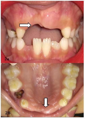 Extraorally, there were no significant findings (Figure 1). Intraorally, patient had mixed dentition with missing maxillary incisors but had slight elevation of left anterior alveolar ridge in the region of left maxillary central incisor (Figure 2a and 2b). Provisionally it was diagnosed as an odontome in maxillary anterior region.