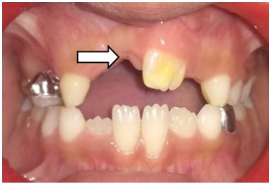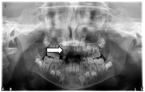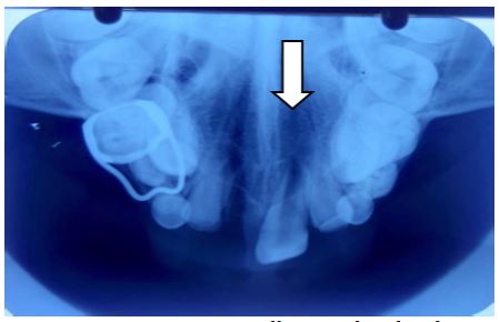 A patient aged 8 years reported to Dept. of Oral Medicine and Radiology complaining of missing teeth in upper front tooth region since 2 years following shedding of deciduous teeth. Patient did not report of any infectious or inflammatory diseases or hereditary anomalies but had a history of trauma to anterior maxilla and nose 2 years back as a result of fall from stairs.