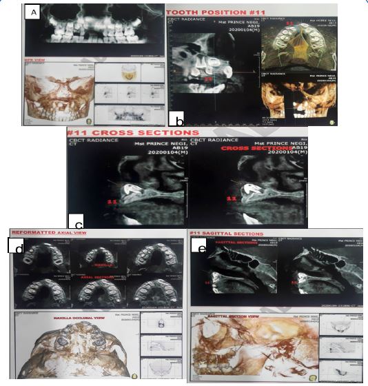 On radiographic investigation, IOPAR (Figure 3) and maxillary occlusal radiograph (Figure 4) revealed well defined radio-opacity superimposing normal radio density of right maxillary central incisor. In addition to above radiographic findings, OPG (Figure 5) also showed that the maxillary right lateral incisor was missing. After assessment of axial and coronal sections of CBCT of maxillary anterior region (Figure 6a, 6b, 6c. 6d, 6e), it was found that there was expansion and thinning of labial cortices of left maxillary central incisor. There was no radiographic evidence of root resorption of adjacent teeth. The root of right central incisor was dilacerated and curved with diffuse periapical rarefaction. At the area of maximum concavity, a well defined radio opaque mass was evident in the midline attached at CEJ of right maxillary central incisor (11) suggestive of odontome attached with the tooth. As a treatment plan, extraction of 11 along with the odontome was advised. After the surgery, the patient was called for follow-up and within a month, partial eruption of left maxiallary central incisor (21) was seen (Figures 8,9).