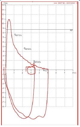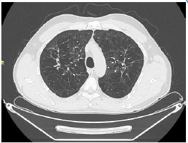 A 56-year-old Caucasian man, former smoker (23 pack years), with a diagnosis of Langerhans Cell Histiocytosis on lung biopsy since about 20 years and in treatment at the Histiocytosis Center of the Policlinico Umberto I, was referred to the Rare Lung Disease Clinic of the Policlinico Umberto I for a clinical picture characterized by dyspnea for mild exertion (MMRC 2). On chest auscultation, reduced physiological respiratory noises were present bilaterally over the entire lung area, but pathological noises were absent. The cardiological objective examination was normal. SpO2 in room air was 97%. Global spirometry (Figure 1) showed mild obstructive ventilatory deficit (FEV1/FVC 62.8, FEV1 3.07 L - 85%), with air trapping indices at nitrogen wash out test (RV: 154%; RV/TLC: 41.3). DLCO was 23.32 ml/min/mmHg, at the lower limits of normal (77% of predicted). An HRCT was performed (Figure 2) showing centrolobular and paraseptal emphysematous lesions with associated destruction of interlobular and interlobular septa, with greater distribution in the upper lobes and middle lobe. In the upper lobes multiple pseudo- nodular lesions were present in continuity with retracting fibrotic striae and traction bronchiolectasis. Because of the presence of a significant amount of emphysematous lesions, although in nontypical lung regions, we decided to assay serum alpha1-antitrypsin, which was found to be 78 mg/dL (PCR 0.13 mg/dL). These values revealed the presence of an intermediate A1AT deficiency.