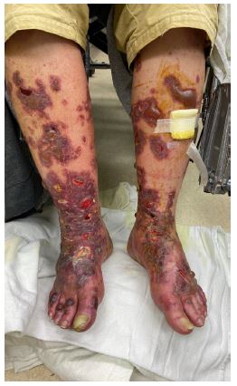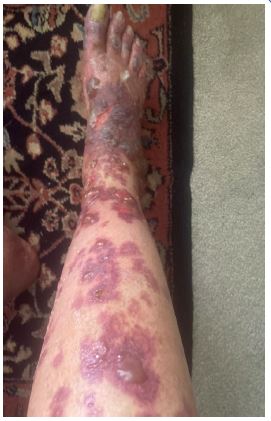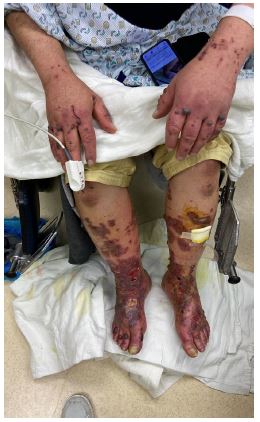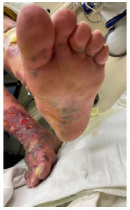 A 61-year-old male with past medical history of peripheral artery disease presented with multiple scattered painful vesicles and bullae, especially prominent on the dorsal feet extending proximally towards the thighs bilaterally as well as on the dorsal aspect of the hands (Figures 1-4). Bullae appeared to be hemorrhagic, honey-crusted lesions and open wounds were noted on bilateral legs. There was also an erythematous macular rash noted on the soles of the feet. Nikolsky sign was negative. No other lesions were noted on the back, chest, abdomen, face, or scalp. Oral mucosa and conjunctiva were normal. The disease course began as an erythematous macular and petechial rash a week before presentation in bilateral feet that coalesced and progressed proximally towards the thighs. Vesicles emerged on the dorsal aspect of the feet which progressed to bullae. Four days before presentation to the emergency department, vesicles also appeared on bilateral dorsal hands and the patient visited a local urgent center to seek care. Keflex, Doxycycline and high-dose prednisone (50 mg) were prescribed for five days without symptom resolution. Due to worsening drainage from bullae and increasing number of new lesions every day (>10/day), he presented to our emergency department.