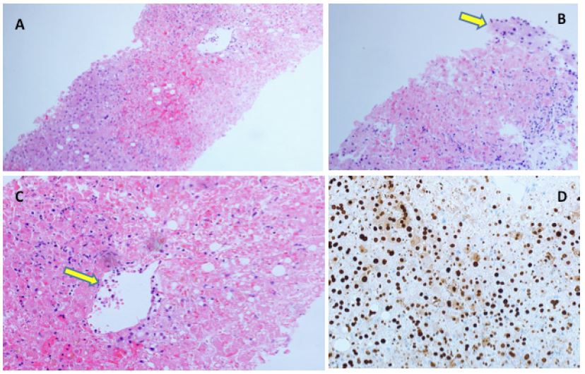 Herpes Simplex Virus (HSV) hepatitis represents a rare complication of HSV infection, which can progress to acute liver failure and in some cases, death. Herpes simplex type 1 (HSV-1) infection in adults usually characterized by mucocutaneous painful rash grouped as vesicular lesions with underlying erythema, which eventually erode, and crust [1].