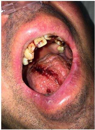 A routine fluoroscopic examination performed to assess the staple lines and gastrojejunal anastomosis on postoperative day 2 was normal. However, hemorrhagic drainage continued, and the patient had bleeding from his gingivae on postoperative day 2 (Figure 2). Because of this reason, the IV fondaparinux dose was reduced to 5 mg from 10 mg and oral transaminase mouthwash was added to his treatment. The volume of hemorrhagic drainage on the postoperative second and third postoperative days was 250 ml and 140 ml, respectively. The patient was followed with iv 5 mg fondaparinux and daily complete blood count examinations. In complete blood count examinations, his hemoglobin level was 15.9 g/dL on postoperative day 1 but gradually decreased to the level of 7.2 on postoperative day 7. Then levels gradually increased to the level of 10.1 g/dl on postoperative day 14 without transfusion. Thrombocyte count increased gradually up to physiological levels in his postoperative course. On the tenth postoperative day, the surgical drain was removed, and the patient was discharged with subcutaneous fondaparinux. The patient fully recovered and was followed up in the surgical and hematological outpatient clinics. Fondaparinux treatment was switched to warfarin after one month of treatment. No thrombocytopenia or thrombotic complications were seen during the outpatient follow-up. In addition, the patient lost 40 kilograms one year after surgery.