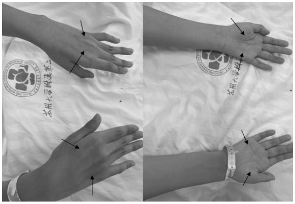 MJH is an 18-years-old Chinese male. He had a wholesome childhood and has no mental illness. Computer games were his favorite. He has no family history of genetic disorders either. 3 years ago, he began to have hyposthenia of left upper limb. The manifestation was that he gradually had difficulty extending his left thumb. Dorsal flexion of the fingers was also problematic. 1 year ago, weakness of the left upper extremity got worse and passed to the right, mainly manifested as hyposthenia of the right forearm. Hypotrophy of palmar and thenar muscles bilaterally begun to appear, more evident on the left. Besides, his weakness got worse on exposure to cold environment, and fasciculation occurred when the affected muscles contracted, limiting his daily activities.