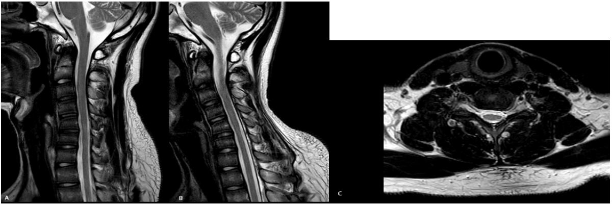 Results: The weakness and hyposthenia of upper limbs are observed. MRI images of cervical flexion showed anterior displacement of the posterior dural sac. Electrophysiological examination showed the magnitude of the compound motor action potentials (CMAPs) is decreased.