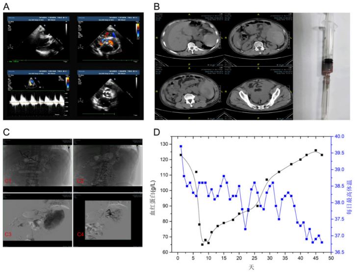 The patient was a 63-year-old male. He was admitted to the hospital after five days of fever. In May 2018, he underwent mitral valve and aortic valve replacement with left atrial appendage ligation in our hospital for rheumatic heart disease. The patient began to experience nasal congestion and rhinorrhea on April 7, 2019 and developed a fever (temperature not measured) accompanied by chills, general weakness, chest tightness, poor appetite, lower extremity pain, mild cough, and production of a small amount of white sputum. On April 12, 2019, the patient felt his symptoms worsening as well as chest tightness after minimal activity. He arrived at our hospital for a physical exam and exhibited the following: Blood pressure 120/80 mmHg, body temperature 39.7℃, heart rate 126 beats/min, pulse 100 beats/min, and 30 breaths/min, minimal atrial fibrillation, no significant murmur, scattered wet crackles in the left lower lung, soft abdomen without tenderness upon applied pressure or rebound, and no edema in the lower limbs. Routine blood work showed the following: 12.83 x 109/L white blood cells, 110 g/L hemoglobin, 48 x 109 /L platelets; coagulation function: INR 1.28, APTT 54 s; liver function: Total bilirubin 54.3 μmol/L, direct bilirubin 39.1 μmol/L, indirect bilirubin 15.2 μmol/L, alanine aminotransferase 55.0 U/L, aspartate aminotransferase 65 U/L, C-reactive protein 54.15 mg/L, PCT 16.01 ng/ml; renal function: creatinine 119.92 μmol/L, NT-proBNP 8651.10 pg/ml, no abnormalities in troponin, myocardial enzymes, blood coagulation, and routine urine results; ECG: Rapid atrial fibrillation; emergency chest CT: Inflammation of the lower left lobe; cardiac ultrasound: Mitral and aortic valve replacement, enlarged left atrium, slightly larger left ventricle, and fullness in the right ventricle, thickened ventricular septum, thickened anterior wall of the right ventricle, and widened aorta, mild reflux in the tricuspid and pulmonary valves, and diminished left ventricular diastolic function. These observations led us to consider the possibility of IE and to improve blood bacterial culture, ceftriaxone sodium (Rocephin), amoxicillin, and potassium clavulanate were used to prevent infection and to treat symptoms. The patient experienced sudden upper abdominal pain on April 14 around 15:20, with profuse sweating, blood pressure of 86/63 mmHg, body temperature of 38.1℃, heart rate of 124 beats/ min, abdominal distension mainly in the left upper quadrant, and upper abdominal tenderness, and was transferred to the emergency room. The ECG data revealed tachycardia, atrial fibrillation, and ST-T changes. The patient’s abdominal pain was slightly relieved upon producing tan stools. The blood test showed 16.97x109/L white blood cells, 78 g/l hemoglobin, and 64 x 109 /L platelets. Planar CT of the chest and abdomen indicated splenic rupture and haemorrhage, abdominal pelvic effusion and haemorrhage, postoperative changes in heart valves,enlarged heart, subpleural inflammation on the dorsal side of both lungs, and small pleural effusion on both sides of the chest (Figure 1). Diagnostic abdominal fluid draw revealed the presence of non-coagulated blood. The patient was transfused with 4 U red blood cells and emergency splenic artery angiogram and embolization was performed. During surgery, retention and extravasation of contrast agent was observed from the inferior splenic artery, which led to the consideration of inferior spleen haemorrhage. Polyvinyl alcohol particles were administered and a coil was applied to embolize the inferior splenic artery. This was followed by angiography showing blockage of the inferior splenic artery and the absence of bleeding (Figure 1). Blood culture was performed again that night and showed the presence of Gram-positive bacteria (S. aureus). The patient was then treated with vancomycin combined with piperacillin and tazobactam to treat the infection and symptoms. The patient was transferred from the ICU ward to the general ward on the 11th day of initial disease presentation, and was discharged on the 47th day.