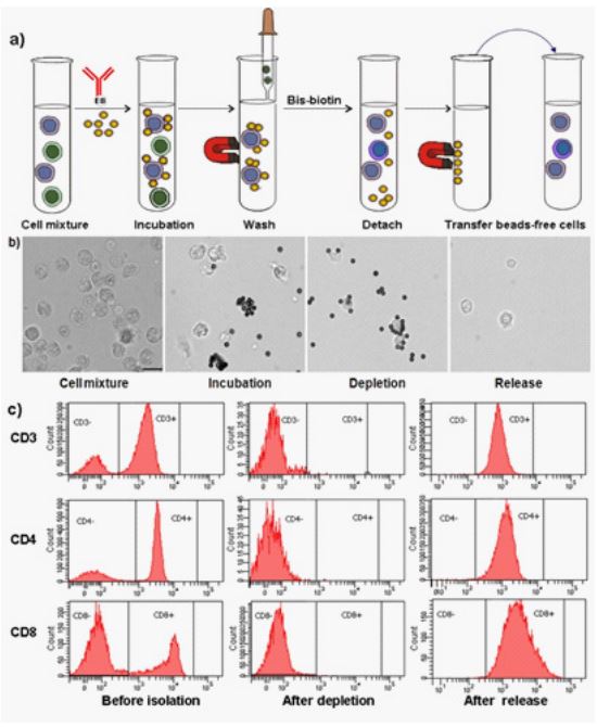 Cell separation is a powerful tool enabling the isolation of cellular subpopulations for biological research and clinical applications [1-5]. Many cell separation techniques are currently commercially available, which are predominantly based on three methodologies: adherence, density, and cell surface marker. Some new techniques based on microfluidic devices and cellular properties are being developed [6,7]. The gold standard for cell separation is fluorescence-activated cell sorting (FACS) and magnetic-activated cell sorting (MACS) [8-11]. These techniques have been extensively used in many applications ranging from in vitro diagnostics to cell-based therapeutics [12-18]. FACS is capable of processing millions of cells and isolating multiple, high purity subpopulations. However, the limitations of this technology are the timeconsuming, high cost, and low recovery, especially in the separation of rare cells [19,20]. MACS is designed for high-throughput separation of specific target cells from complex mixtures based on immuno-magnetic labels [11,21]. These MACS techniques have been classified based on the size of magnetic particles, such as MACS® (20-100 nm, Miltenyi Biotec); IMAG® (100-500 nm, BD Biosciences); Dynal® (1-5 µm, ThermoFisher Scientific). The MACS® technique usually doesn’t require the bead removal step after positive cell separation, due to the small size (~50 nm) and biodegradability of magnetic particles [22]. But, a strong external magnetic filed must be applied to capture the small size of magnetic particles. In some particular applications such as cell sequential sorting based on more than one surface marker (MultiSort strategy), the prior removal of the beads used in the first sorting step is required for next-step selection [23,24]. Using microbeads such as Dynabeads (1-5 µm) for cell separation allows for being easily “pulled out” from cell suspension with a simple magnetic separator such as an MPC separator [25,26]. However, in many cases, the removal of larger superparamagnetic particles from the cell surface is necessary for down-stream applications [11].