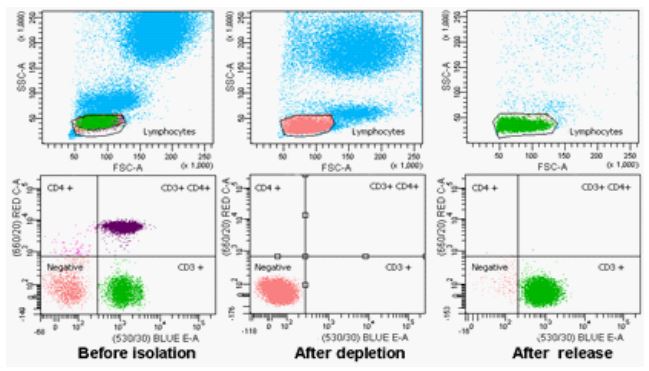 An important application in cell separation is to isolate cell subpopulations based on dual cell surface markers. Miltenyi Biotec has developed a MultiSort strategy, which involves first incubating a cell mixture with MultiSort MicroBeads to capture cells of interest based on the first cell surface marker, and then enzymatically cleaving the MultiSort MicroBeads. The isolated cells are then incubated with MACS® MicroBeads to capture the cell subset based on the second cell surface marker. Another method of cell separation based on dual cell surface markers involves using two different sizes of immunomagnetic beads (MACS® MicroBeads and M280 Dynabeads), which eliminates the need for detaching MACS® MicroBeads used in the first selection step [37]. However, both strategies require a two-step sequential selection. To develop a more straightforward workflow of cell separation based on dual cell surface markers, we proposed a new approach using biotin and biotin analog with different binding affinity. To test the hypothesis, we chose a cell model system of human peripheral T lymphocytes based on dual cell surface markers (CD3 and CD4). The anti-CD4 mAb was labeled with biotin molecule and AlexaFluor 647 (Labeling AlexaFluor dye is for flow cytometry analysis purposes); and anti-CD3 mAb was labeled with N3′-ethyl biotin and AlexaFluor 488. PBMCs (3 × 107 cells) were incubated with anti-CD4 mAb-biotin conjugate and anti-CD3 mAb-N3′- ethyl biotin conjugate simultaneously on ice for 10 minutes. Then, streptavidin M280 Dynabeads were added and incubated for 10 minutes at room temperature. After the washing step to remove unbound cells, the magnetically labeled cells were selectively released by incubating with 1 mM bis-biotin for 5 minutes to yield beads-free CD3+CD4− cells. As shown in Figure 3, after incubation with biotinylated anti-CD4 mAb and N3′-ethyl biotinylated anti-CD3 mAb, the cells either CD3+ or CD4+ have been captured by streptavidin M280 Dynabeads with depletion efficiency (~100%). After incubating with 1 mM bis-biotin, CD3+CD4− cells were selectively detached from magnetic beads with 80 ± 5% recovery, 92 ± 3% purity and 95 ± 2% viability, and CD4+ cells remain bound to magnetic beads. These results show that the N3′-ethyl biotin can be selectively detached from streptavidin without interfering with biotin-streptavidin interactions by controlling the release conditions. This strategy provides a simple one-step cell selection method based on dual cell surface markers.