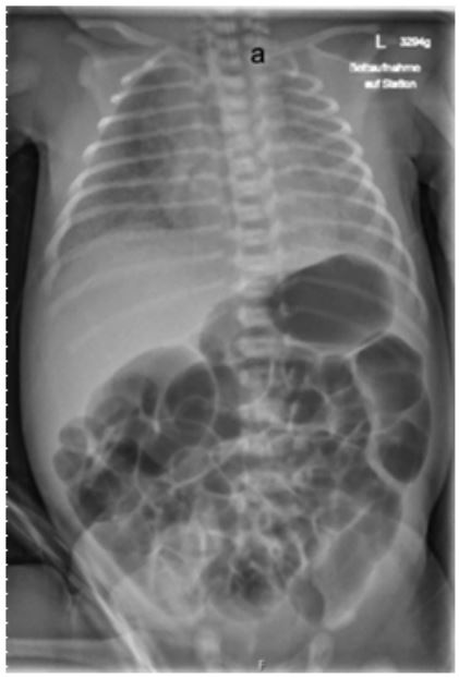The delivery was performed at 37 completed weeks of gestation via Cesarean section due to velamentous insertion. The neonate was postnatally vital, with APGAR scores of 7/8/9 and birth weight of 3295 grams (64th percentile). Immediately after birth the infant exhibited respiratory distress and an increased oxygen requirement, necessitating the initiation of CPAP- therapy. Placement of a gastric tube was not feasible, and an X-ray revealed an esophageal blind pouch (Figure 1).