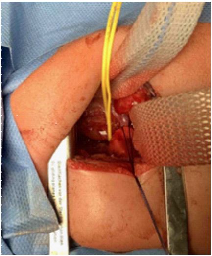 An open surgical approach was chosen to create a precise surgical access and reach the affected area of the esophagus. A type 3b esophageal atresia was found.