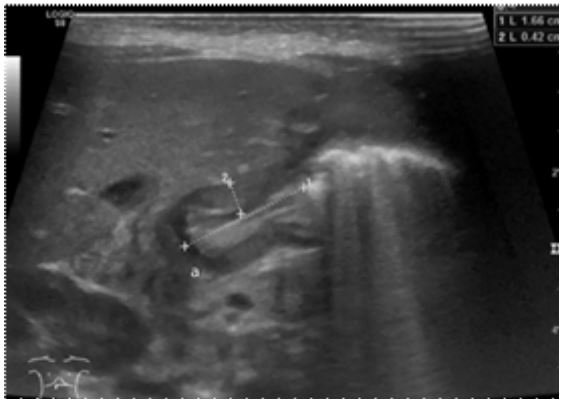 After radiographic assessment the postoperative nutritional intake proved to be challenging. The patient began experiencing repeated episodes of projectile vomiting and showed no signs of weight gain. An ultrasound examination of the abdomen was conducted, revealing the characteristic pattern of hypertrophic pyloric stenosis (Figure 4).