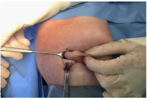 An open surgical approach using the Bianchi- transumbilical- method was chosen to create a precise access to the pylorus. Intraoperatively, the pylorus exhibited significant hypertrophic, as previously described in the ultrasound (Figure 5). A myotomy was performed, involving the removal of the hypertrophic muscle layer to eliminate the stenosis.