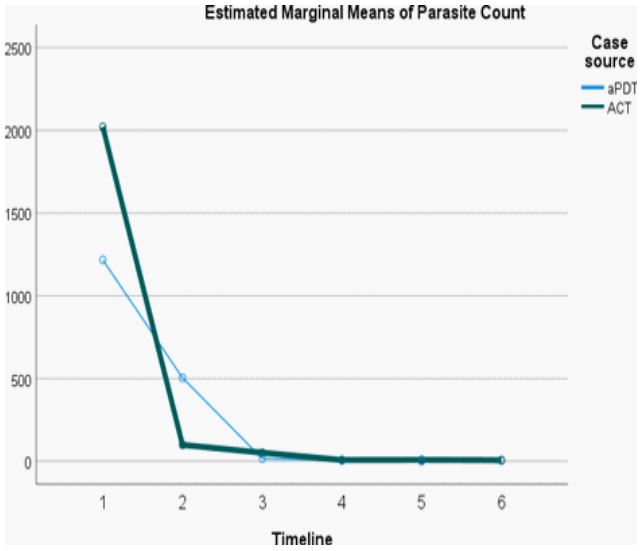 Both treatments resulted in a reduction in measured parasite counts. In the PDT group the parasite count was significantly decreased from day four onwards, with 70.8% of the patients parasite free compared to 53,7% in the ACT group. Mean parasite count on day 4 could be reduced from 3552 at baseline to 142,14 (Std Deviation 727,09) compared to a drop from 1881 at baseline to 251,66 (STD deviation 1237,30) at day 4 in the ACT group.
