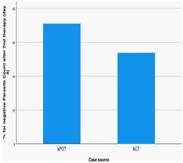 A significant improvement with conventional care, as well as with PDT could be observed. In the aPDT Group with the use of Riboflavin (Vitamin B2) as a photosensitizer the clearance of parasites out of the bloodstream compared to standard ACT therapy after 9 days was 83,3% respectively 73,3%. No dangerous decrease in WBC count could be measured throughout the study in both groups. During both treatments there was no change in packed cell volume detectable. No further side-effects or adverse reactions were reported during the treatment and according to data nor age or gender affected the efficacy or safety. This is consistent with the previous in vitro investigations on aPDT using Riboflavin as an photosensitizing agent [17,21].