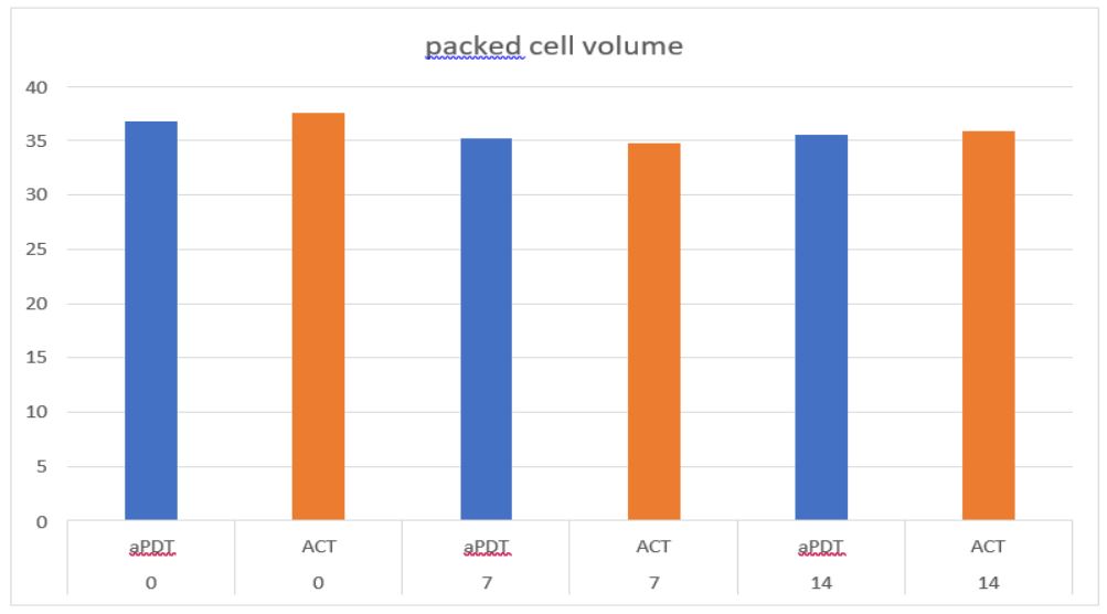 White blood cell count (WBC) and the packed cell volume indicated as safety markers for both treatment approaches (PDT and ACT).
