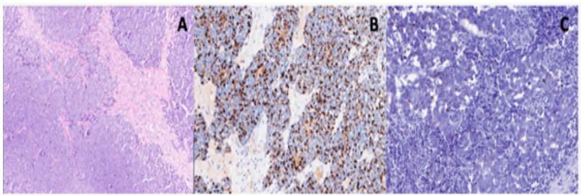 At our visit she was asymptomatic, presenting at the clinical examination palpable nodules in the right inguinal region. The Chest-Abdomen computerized tomography scan (CT-scan) showed a right external iliac (43 mm) and two inguinal lymph-nodes (20 mm). The somatostatin receptor scintigraphy (SRS) was negative, and the positron emission tomography with 2-deoxy-2-[fluorine-18] fluoro-D-glucose integrated with computed tomography (18F-FDG-PET/CT) showed high uptake in these lymph-adenopathies. (Figure 2. A, B and C).
