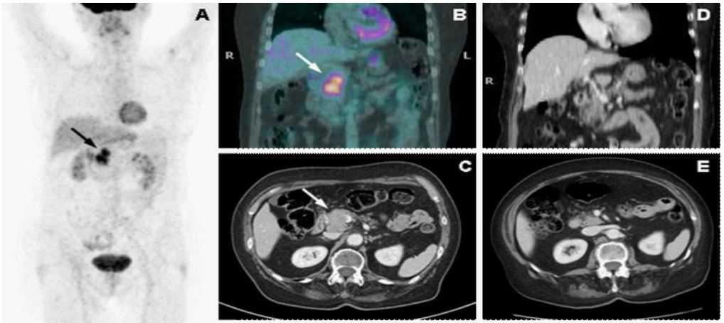 In April 2009, after five cycles of chemotherapy, a retropancreatic area of uptake appeared at the 18F-FDG-PET/CT, without clear morphological alteration at the CT-scan. Due to the not sure relapse the multidisciplinary team decided to complete chemotherapy performing the sixth cycle and subsequently perform an active surveillance with CT-scan and clinical examination.